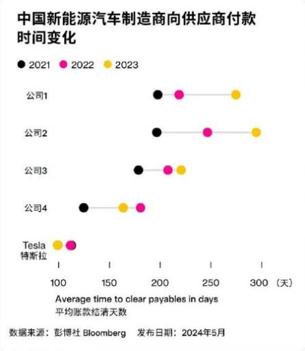 中国《财经》杂志统计,2024年中国车企的平均付款周期超过170天,部分车企甚至超过240天。彭博社汇编数据显示,比亚迪2023年的付款周期更长,达到275天。