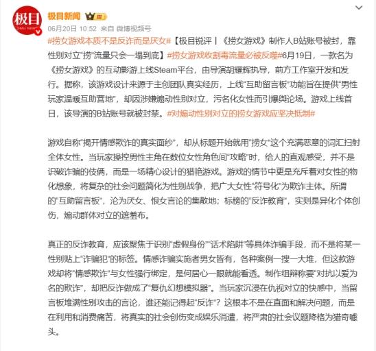 就在舆论吵成一团时,《捞女游戏》在各大社媒平台的账号陆续被封禁,导演胡耀辉在视频网站Bilibili的账号也被封。对此,湖北日报传媒集团旗下的极目新闻,发表题为“《捞女游戏》制作人B站账号被封,靠性别对立‘捞’流量只会一塌到底”的评论,直指该游戏的本质不是反诈,“而是厌女”。