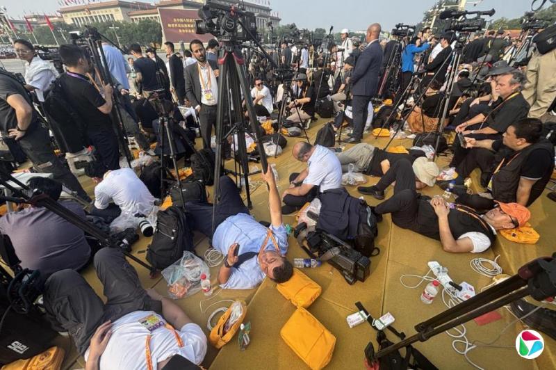 一些彻夜未眠的记者为了补眠,干脆趁阅兵式开始前,直接躺在长安街旁的媒体拍摄区闭目养神。