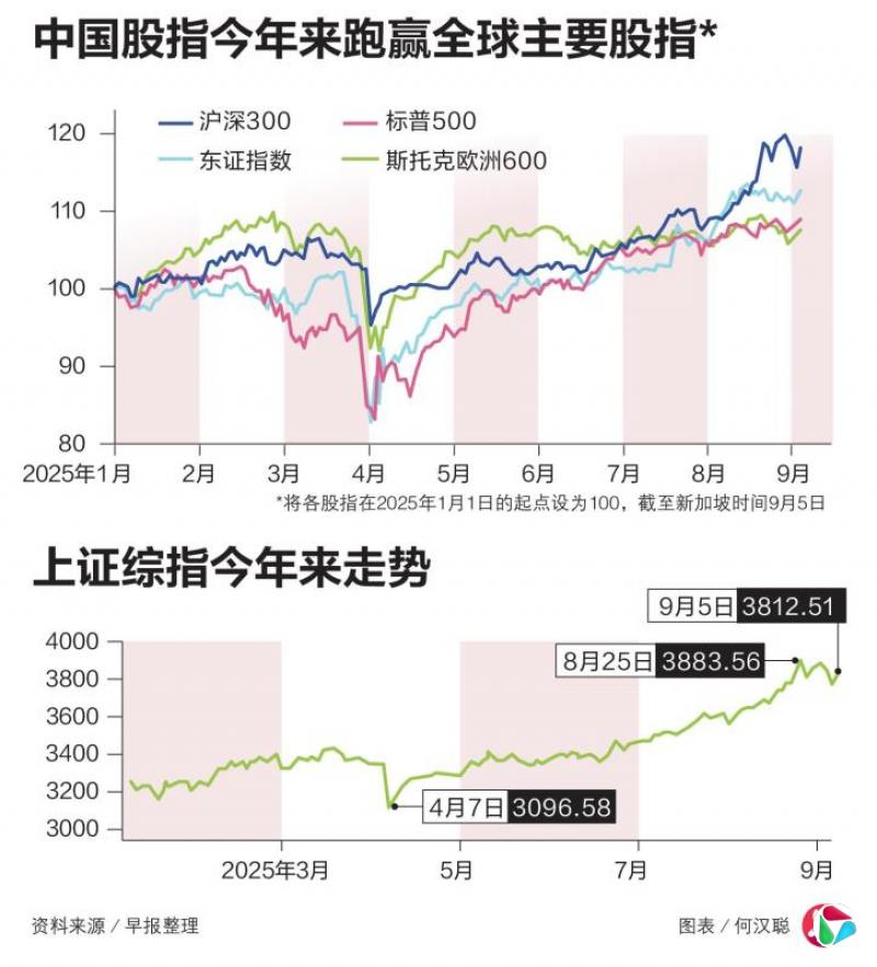 在此之前,沪指刚在8月25日录得3883.56点的10年新高,离4000点大关仅一步之遥。反映沪深两市蓝筹股走势的沪深300指数,今年来累计上涨近17%;不仅逆转过去三年跌势,表现也优于美国、欧洲和日本等全球主要股指。