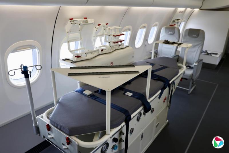 据中国商飞介绍,C909医疗机最大设计商载10吨,标准航程可达3700公里,具备高高原机场起降能力。舱内布局可根据不同救援需求灵活改装,能够满足医疗救援队伍出行、边远地区医疗救助、伤病员转运等多场景应用。