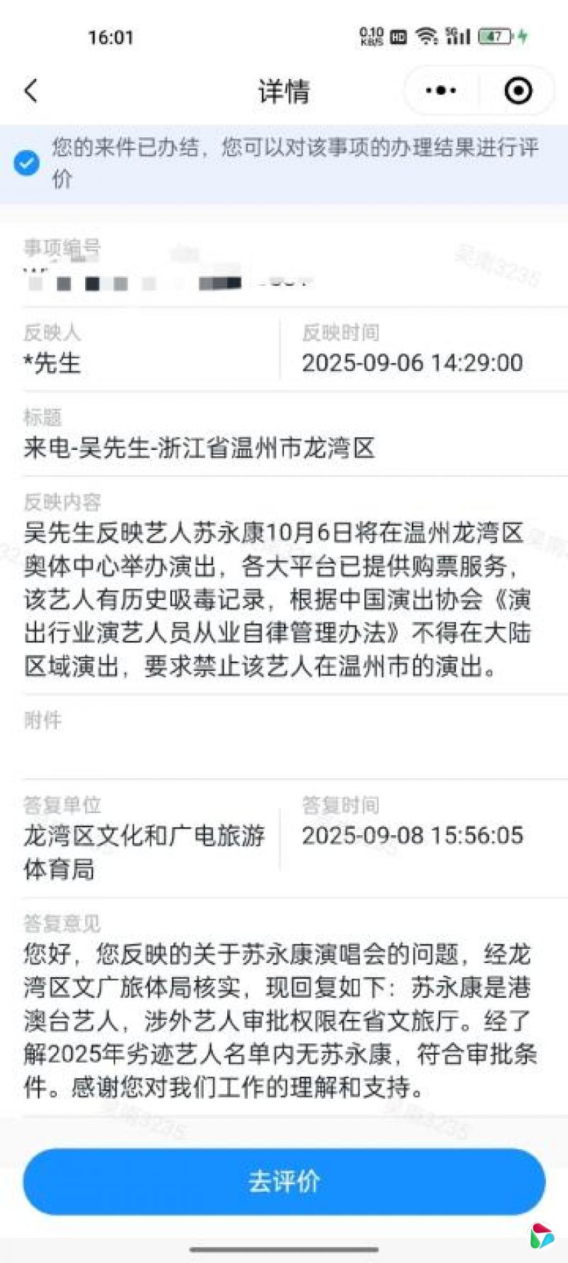 “老吴”在贴文中附上一张图,内容显示温州龙湾区文化和广电旅游体育局的答复工单,当中写道:“苏永康是港澳台艺人,涉外艺人审批权限在省文旅厅。经了解2025年劣迹艺人名单内无苏永康,符合审批条件”。