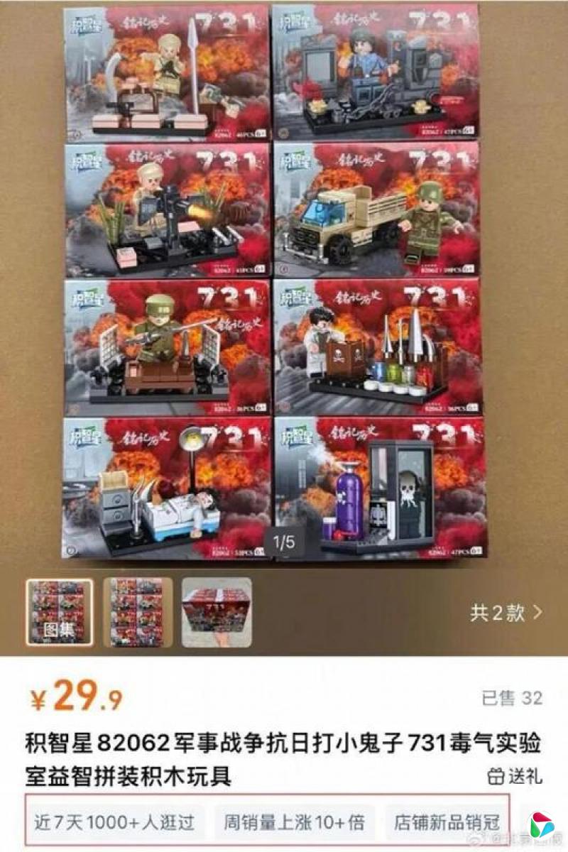 这款在购物平台淘宝上架的“731毒气实验室益智拼装积木”套装共有八盒,场景涵盖人体实验、生物制毒所、机枪扫射等。包装上还印着“铭记历史”“爱国教育情感启蒙”“军事主题历史还原”等字样,售价29.9元人民币。