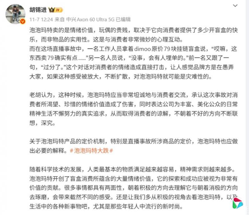 胡锡进还提到,对泡泡玛特来说,直播事故绝对是一个教训,并称作为一个销售情绪价值的公司,这样的直播事故根本就不该发生。