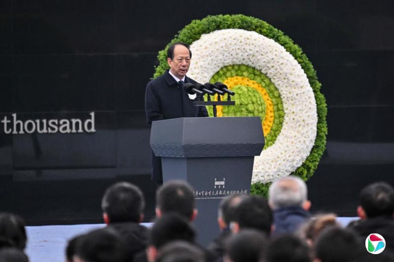 新华社文字通稿中的石泰峰讲话,没有收录上述不点名警告日本的发言,仅提到缅怀死难者和先烈等与过去几年公祭致辞基调相同的内容。