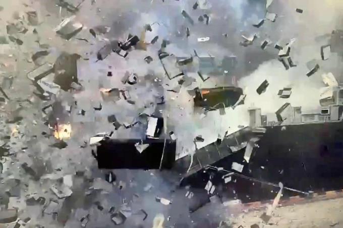 货轮“动明”船上集装箱发生燃爆,集装箱、货物碎片迸发飞散的瞬间。(路透社视频截图)
