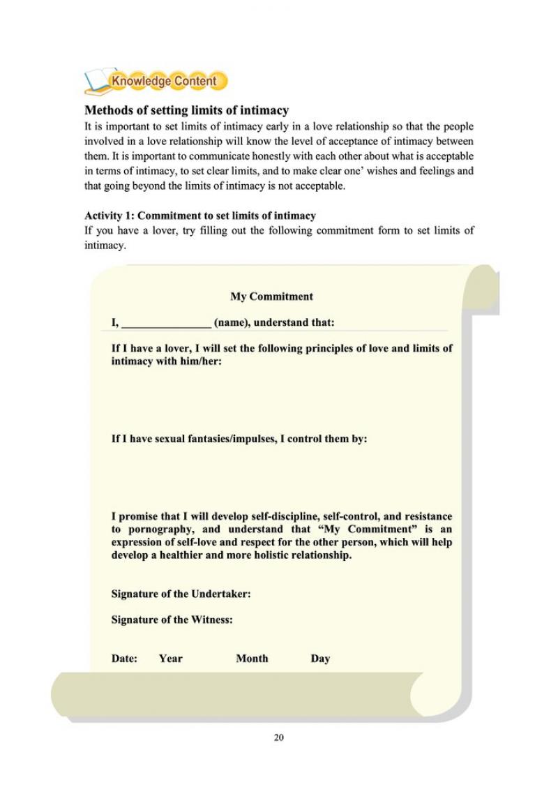 教育局上周公布了一份70页的性教育材料,其中包括给青少年的工作表和对教师的指导。该文件强调,这些课程并不是为了鼓励学生“过早谈恋爱或进行性行为”。它还建议“恋人”填写一份表格,为他们的亲密关系设定界限。