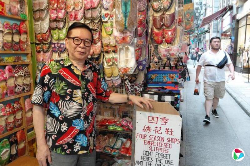 有“中区女人街”之称的香港中环利源东街,只有短短四五十米长,10多名商贩每天在街边做生意,售卖不同的货品。其中,位于街道中央的“四季绣花鞋”,专门卖传统绣花鞋,铺子外手写的招牌特别引人注目。
