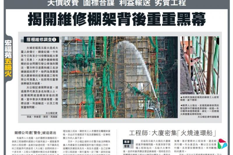 这系列题为《揭开维修棚架背后重重黑幕》的报道共有四篇。其中一篇引述不愿具名的工程业界代表说,十多年来,香港工程公司围标的情况非常严重,甚至有工程公司负责人参与竞标后立即被人恶言警告,无奈退出竞标,“导致有水准的公司越来越少,没有多少间公司投标,竞标的结果自然就来来去去都是那几间了”。