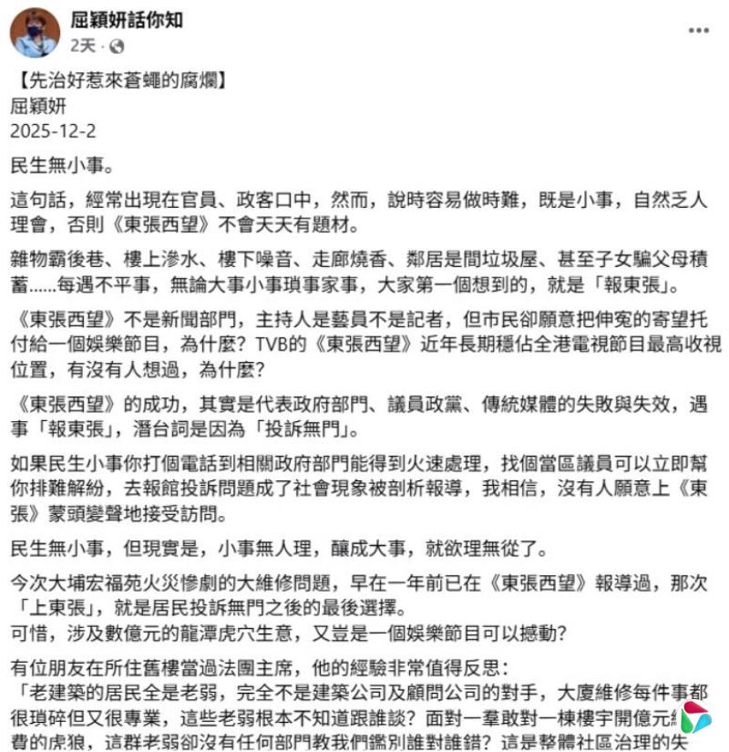 立场亲政府的香港媒体人、专栏作家屈颖妍星期二(12月2日)在脸书专页发出题为《先治好惹来苍蝇的腐烂》的文章。文章写道,民生无小事,但现实是,小事无人理,酿成大事,就欲理无从了。“今次大埔宏福苑火灾惨剧的大维修问题,早在一年前已在《东张西望》报道过,那次‘上东张’,就是居民投诉无门之后的最后选择。”《东张西望》是香港无线电视的一档节目。