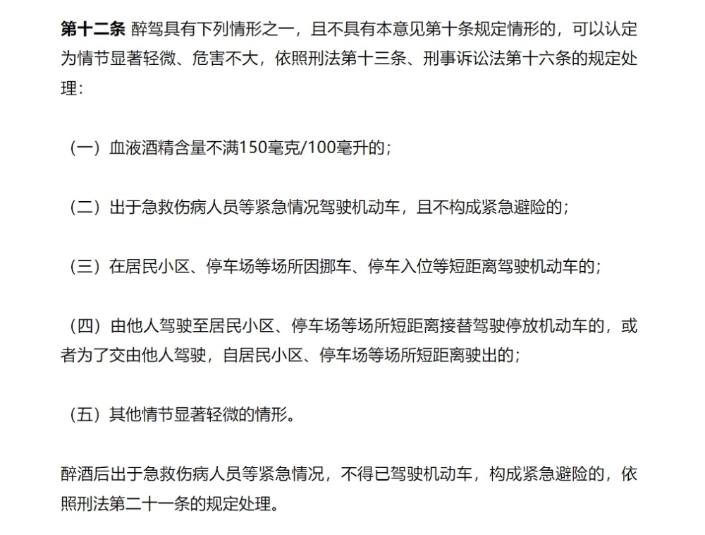 以大家最关心的醉驾可以不起诉的情形来说,这次《意见》的第12条规定:(二)出于急救伤病人员等紧急情况驾驶机动车,且不构成紧急避险的;(三)在居民小区、停车场等场所因挪车、停车入位等短距离驾驶机动车的;(四)由他人驾驶至居民小区、停车场等场所短距离接替驾驶停放机动车的,或者为了交由他人驾驶,自居民小区、停车场等场所短距离驶出的,等等,可以适用有关不起诉等从宽处理规定,都是有的放矢的细化政策。