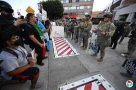 大街中央遭纵火的汽车冒起滚滚黑烟,示威者站在满是涂鸦的德士上,高举墨西哥国旗。 要不是背景里的路牌上是美国加利福尼亚州著名的101号国道标志,难以猜到这就在洛杉矶。