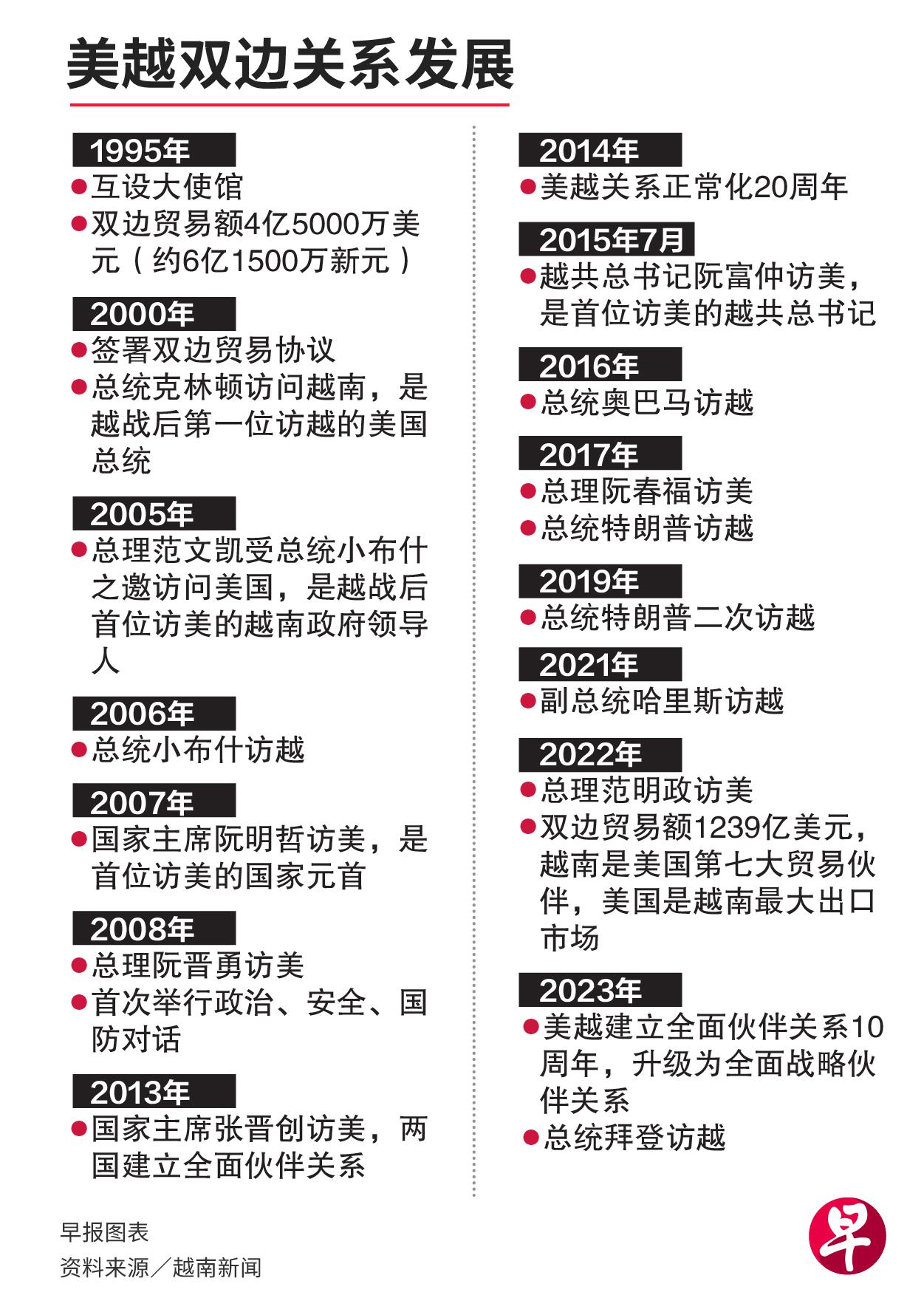 越南外交部副部长何金玉在拜登到访前接受当地媒体访问时提到,美越关系正常化近30年来,两国贸易发展迅速,双边贸易额从1995年的4.5亿美元(约6.1亿新元),增至去年的1230亿美元(约1678亿新元)。越南已成为美国第七大贸易伙伴,也是美国在亚细安的第一大贸易伙伴。