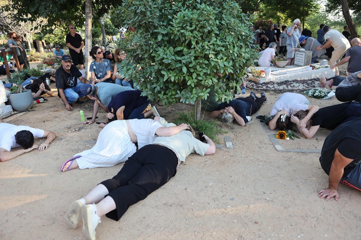 10月12日,一群以色列人在特拉维夫附近一个社区为遇难亲友举办葬礼时,哈马斯的火箭触发防空警报,葬礼中断,人们赶紧趴下抱头躲避。(法新社)