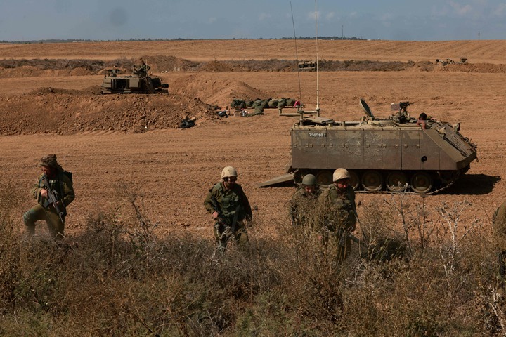 10月15日,以色列装甲车和军人在加沙地带边界附近集结。以色列军方发言人说,以军正在等待对加沙地带进行大规模地面攻势的“政治决定”。(法新社)