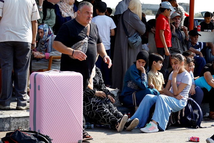 10月14日,拥有双重国籍的巴勒斯坦人在加沙南部拉法市(Rafah)与埃及的过境通道等待获准进入埃及避难。(路透社)