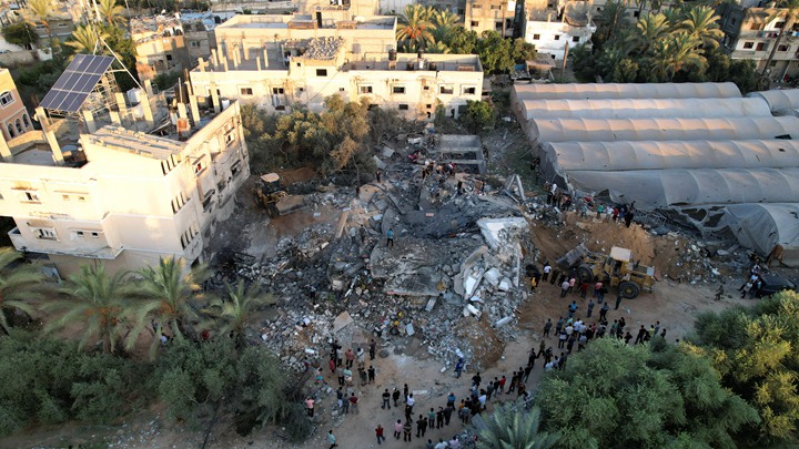 以色列10月8日向加沙地带展开猛烈空袭,加沙市一栋民宅被炸毁,救援人员和居民尝试展开救援。(法新社)