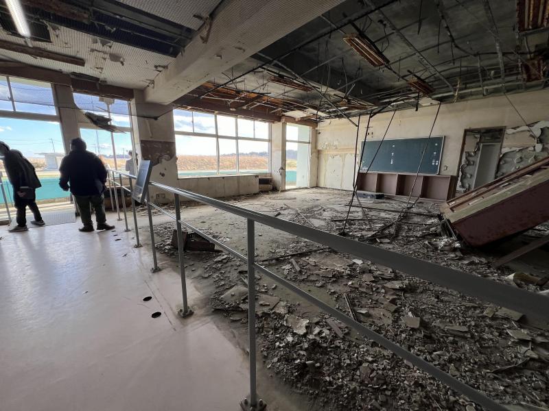 除了核电站,福岛唯一没有被15米高海啸彻底摧毁的建筑——浪江地带的请户小学,如今也成了展区,游客可自行参观。距离核电站仅五公里的请户小学,当时只是局部被毁,而事发时学校所有学生安全撤离,是这场灾难中少有的一个安慰。校舍的二楼至今保留原貌,被力量无限大的海啸击毁的痕迹历历在目。