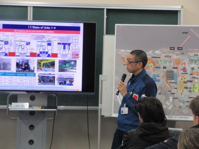 进入核电站园区之前,东电的讲解员先讲解了核电站的结构,以及海啸引发的核灾过程。2011年3月12日,即地震后的第二天,厂内的1号机组发生了氢气爆炸。为了不影响2号和3号机组,工作人员利用反应堆隔离冷却系统、高压注水系统和消防车持续为机组注水。然而,2号机组被发现通风系统故障,3号机组则于14日发生了氢气爆炸,导致大量的放射性物质被释放到外部环境。当时,正在进行定期检查的4号机组也因从3号机组流入的氢气而被点燃爆炸并受损。
