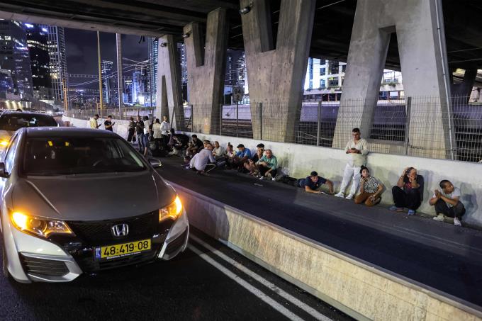 空袭警报响起后,特拉维夫的许多人在一座天桥下停车躲避。(法新社)