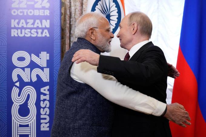 10月22日,金砖国家峰会在俄罗斯喀山举行期间,俄罗斯总统普京(右)与印度总理莫迪会谈。(路透社)