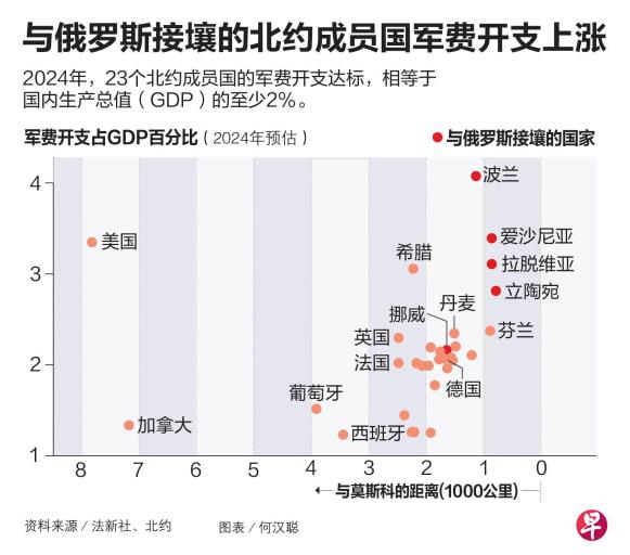 欧洲这几年也不是毫无作为。根据北约网站,在特朗普首次就任总统的2017年,北约只有四个成员国的国防预算达到北约定下的最低标准,即相当于国内生产总值(GDP)的2%。到了2024年,达标国家已有23个。当中,与俄罗斯接壤的波兰将GDP的4.12%用于国防,高于美国的3.4%。波罗的海国家爱沙尼亚和拉脱维亚的军费比率也高于3%,两国皆毗邻俄罗斯。