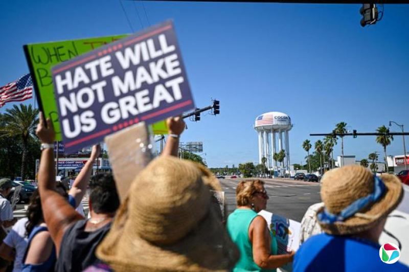4月19日,美国佛罗里达州可可市,示威者举着标语“仇恨不会使我们更加伟大”反对特朗普。(法新社)