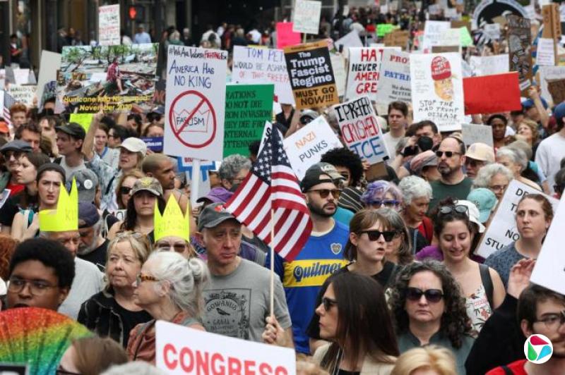 路透社报道,媒体镜头显示,在白宫外,抗议者举着写有“工人应该拥有权力”、“不要王权”、“停止武装以色列”和“正当程序”的横幅。