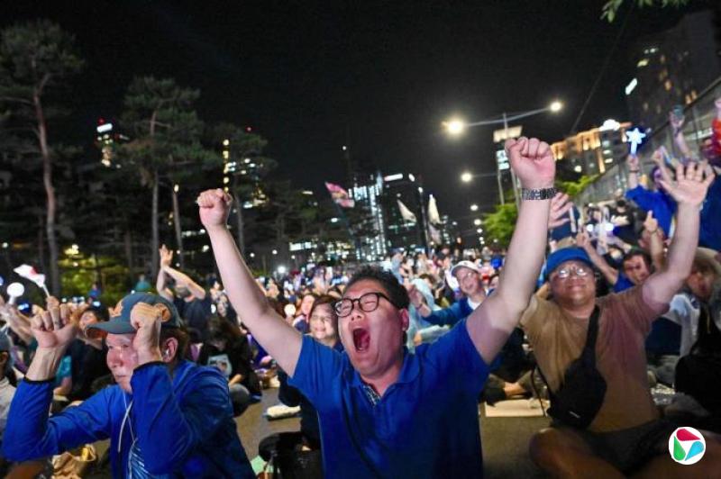 出口民调公布后,共同民主党竞选总部掌声雷动,支持者高呼“李在明”,现场充满庆祝氛围。相较之下,国民力量选举对策本部气氛低迷,尽管此前喊出“逆转胜”口号振奋士气,但与预期落差明显,一些议员甚至提前离席。