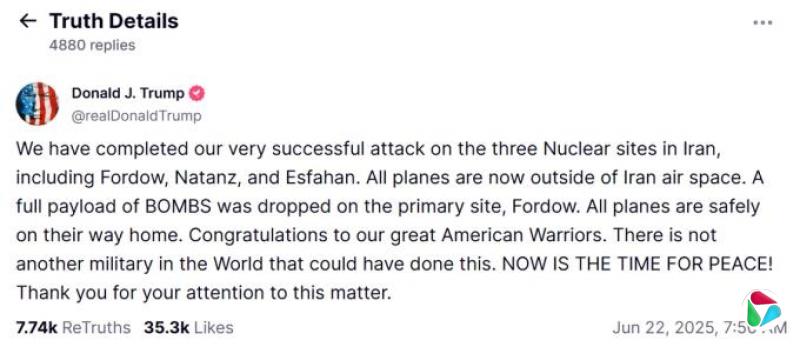 特朗普在他的社交媒体平台Truth Social上发文说,“所有战机正安全返航”,并向“伟大的美国战士们”表示祝贺。他在贴文结尾写道:“现在是实现和平的时候。”
