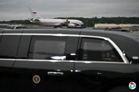 俄罗斯总统普京星期五(8月15日)上午飞抵埃尔门多夫-理查森联合基地后,与美国总统特朗普一起坐上特朗普的座驾——绰号“野兽”的美国总统专车。