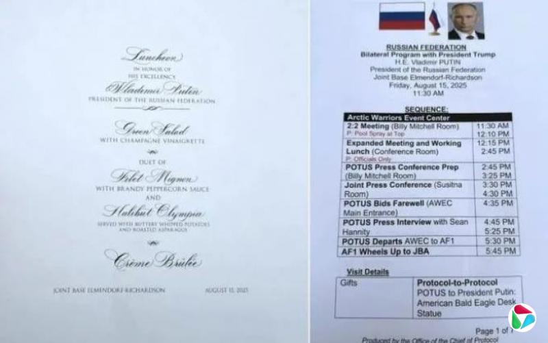 根据获取到的文件显示:8月15日峰会日程精确到联合军事基地内的具体会议室名称,还透露特朗普计划向普京赠送“美国白头鹰桌饰雕像”。第二至五页不仅列出美俄13名政要姓名,更包含三名美方工作人员手机号,甚至为俄方人员标注发音指南,例如普京总统标注为“POO-tihn”。
