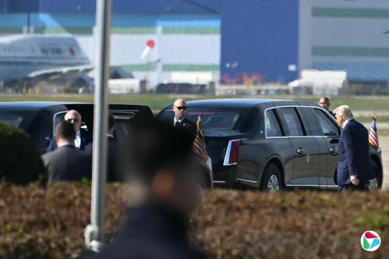 中国国家主席习近平同美国总统特朗普韩国釜山会晤正式开始。图为特朗普(右)星期四上午抵达釜山机场。(法新社)