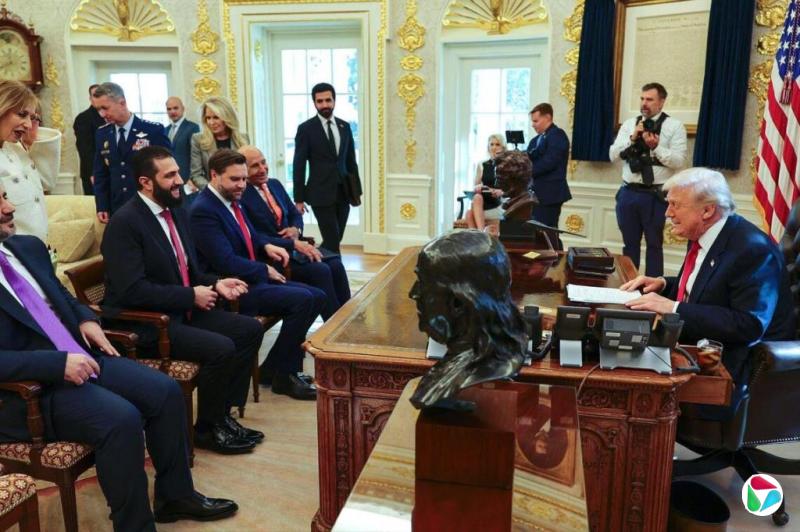根据叙利亚阿拉伯通讯社发布的照片显示美国总统特朗普(右)在白宫会见叙利亚总统沙拉(左二)、叙利亚外交部长沙伊巴尼(左一)、美国副总统万斯(右二)和美国叙利亚问题特使拉克(右一)并排而坐。(法新社)