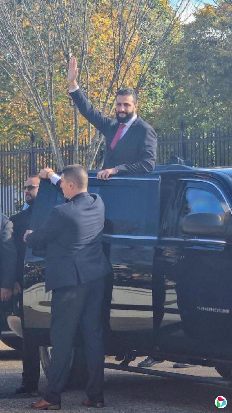 叙利亚总统沙拉在华盛顿与美国总统特朗普会晤后,在白宫外的街道上向支持者挥手致意。(路透社)