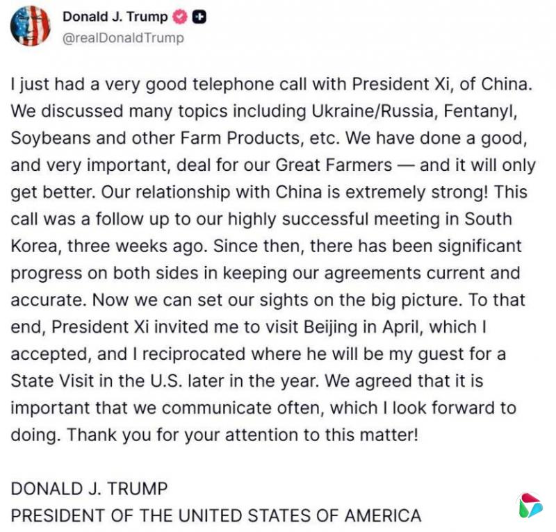 美国总统特朗普星期一(11月24日)与中国国家主席习近平通电话后,在社交平台写道,双方进行了非常好的通话,并称已接受邀请在4月访问中国北京。(特朗普Truth Social账号)