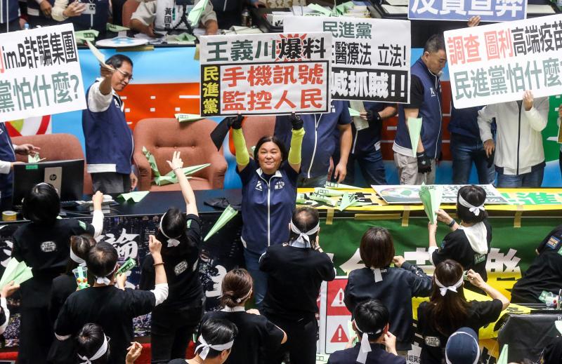 国民党立委陈玉珍(中)星期二在立法院内高举抗议字牌,批评民进党利用手机讯号监控人民。另一端民进党立委则向主席台上射出绿色纸飞机。(法新社)