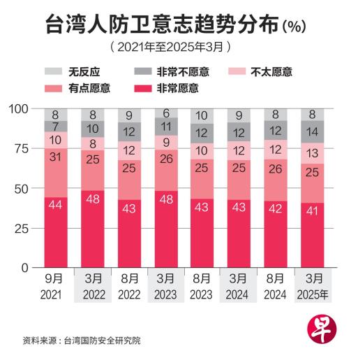 面临日益严峻的台海情势,台湾民众的抵抗意志近年普遍可达七成,但统独意向方面,绝大部分选择较温和的“维持现状”。这也显露台湾民众的防御意志,可能建立在“保卫现有生活方式”与“反对武力威胁”的理性避战策略基础上。