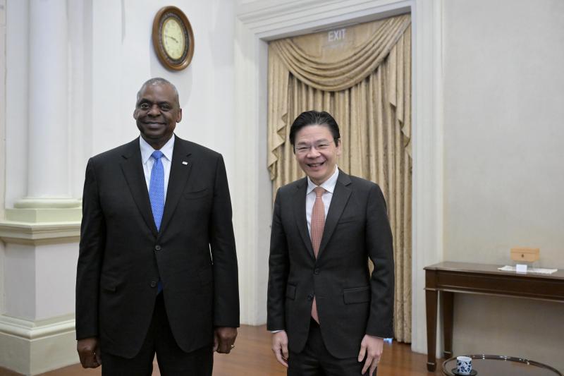 新加坡总理黄循财(右)会见美国防长奥斯汀时,强调新加坡支持美国在本区域活动。(海峡时报)