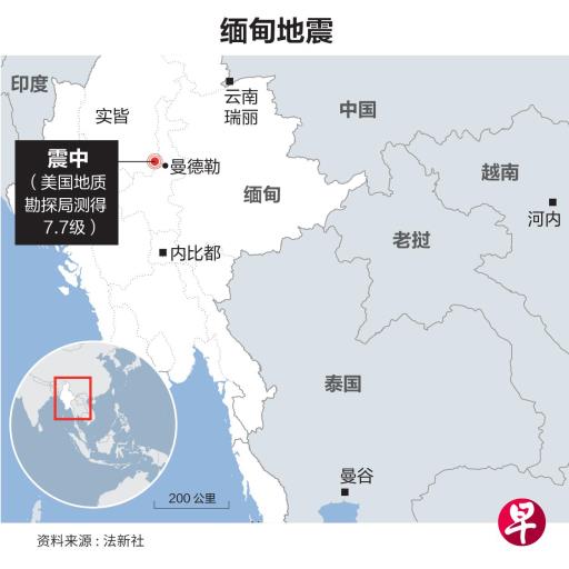 缅甸星期五(3月28日)发生强烈地震,造成逾百人死亡。震央位于中部主要城市曼德勒附近,首都内比都及第一大城市仰光震感强烈,周边国家包括泰国、中国、越南、老挝和马来西亚都有明显震感。