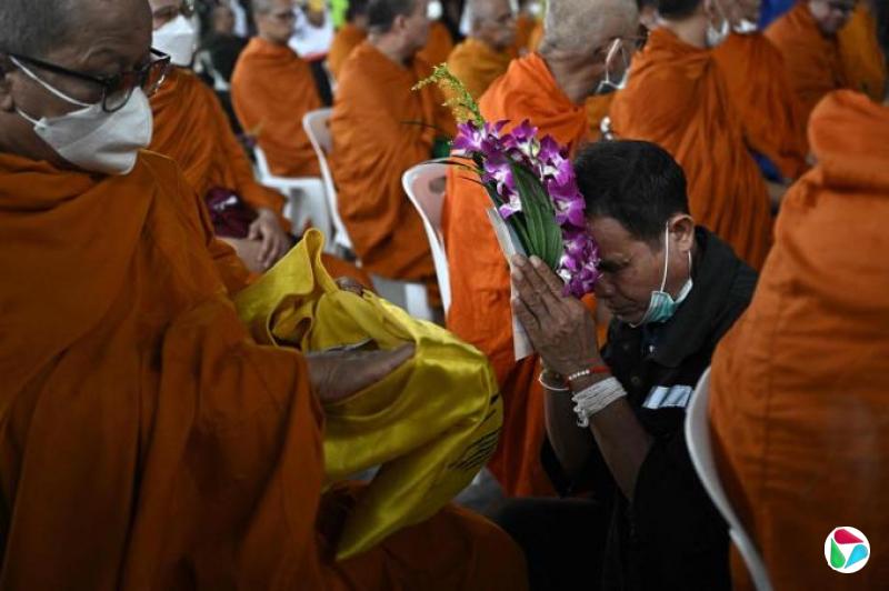 曼谷金佛寺的僧侣星期四(4月10日)到塌楼旁为遇难者诵经,遇难者家属也参加了仪式。(法新社)