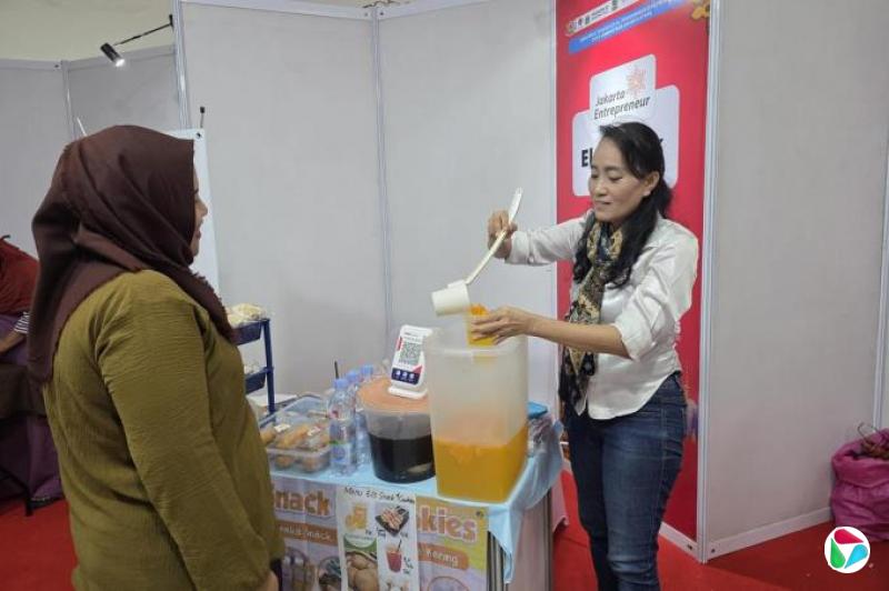 雅加达职业展的一个摊位,海伦娜卖着她亲自烘焙和调制的糕饼、玉米香肠和果汁。过去两年,她通过社交媒体营销,经营小本饮食生意,赚取微薄收入帮补家用。