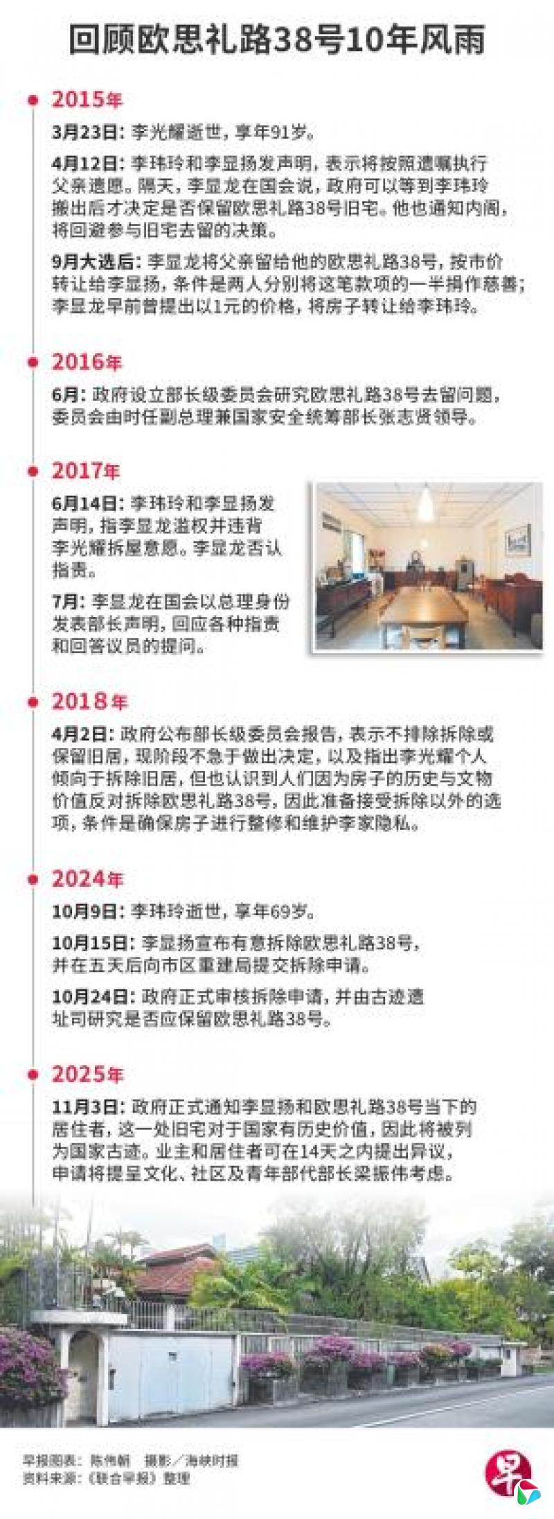 李光耀2015年3月23日辞世。时任总理李显龙作为长子,同年4月15日通知内阁,他将回避参与政府就拆除或者保留李光耀故居的决策,委任时任国务资政兼国家安全统筹部长张志贤,负责领导部长级委员会研究各种选项。